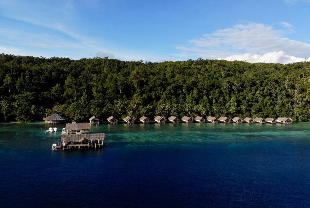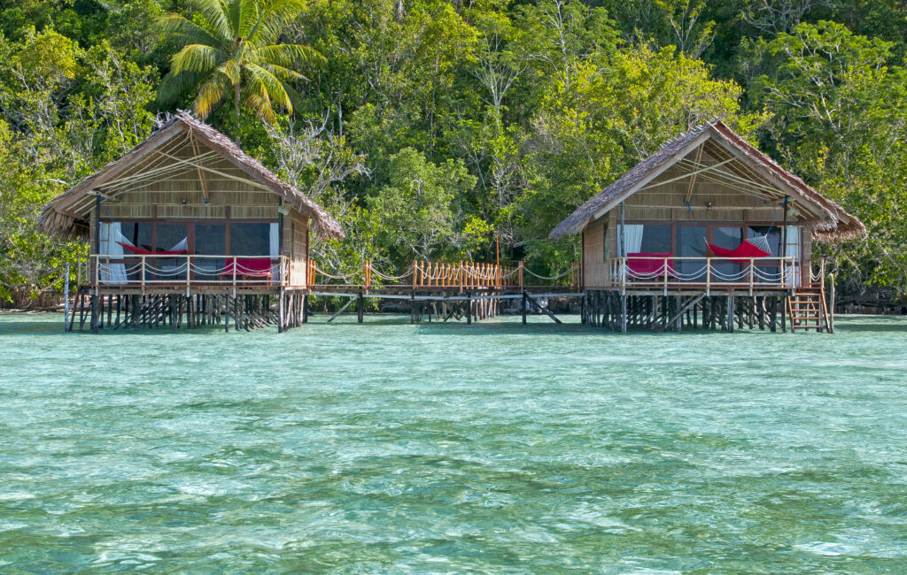 Papua Explorers is an all-inclusive dive resort located on the south coast of Gam Island, surrounded by the most iconic dive sites in Northern Raja Ampat. All resort bungalows, the restaurant and the dive centre/pier with adjacent spa have been constructed the traditional way – over-water with individual walkways on stilts and glorious views sweeping Dampier Strait from Cape Kri to Mansuar Island.