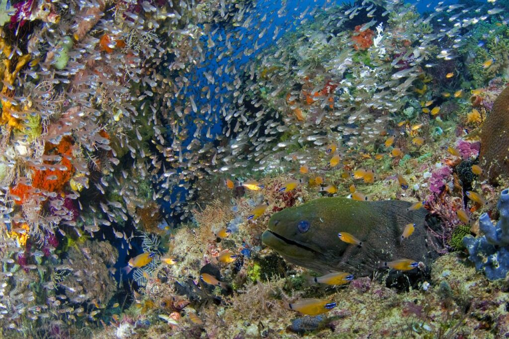 Raja Ampat diving is breathtakingly spectacular, and truly unforgettable. Hard and soft corals compete for space on reefs that are bursting with life and color. Swarms of small fish such as damsels, fusiliers and anthias mill about on the reef flats. Not too far away the large schools of tuna, trevally and mackerel congregate. Batfish, surgeonfish and barracuda aggregate around jetties and reef points. While angel and butterflyfish decorate both the reef flats and jagged coral towers that are home to abundant marine life.