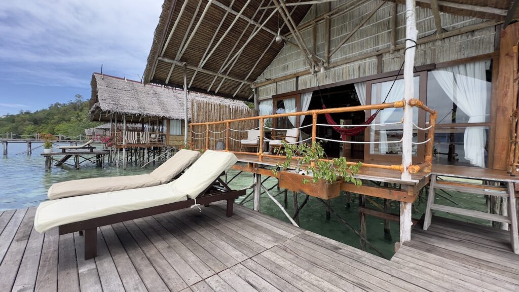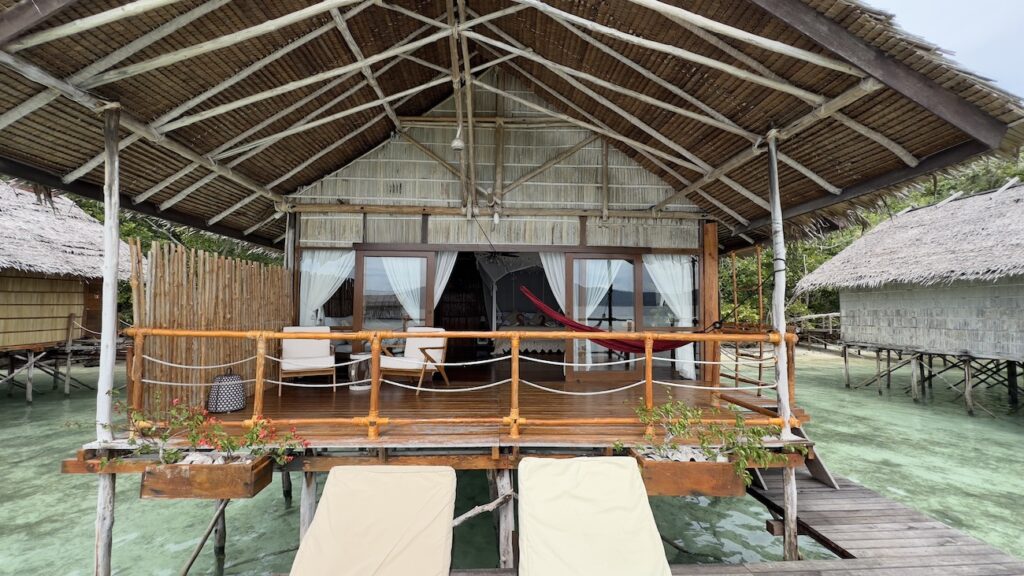 Only 15 wooden bungalows line up along a massive house reef wall with miles of dense rainforest providing the daily soundtrack, complementing the sound of water lapping underneath every structure. The spacious and airy bungalow interiors lead to spectacular decks, each with sun chairs, hammocks and – most importantly- stairs for direct access to the house reef for swimming and snorkelling in medium and high tide.