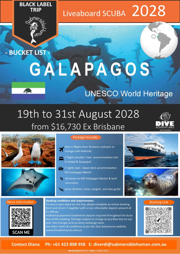Our tour departs Brisbane, travelling via Auckland, Chile and then onto Ecuador, landing on San Cristobel Island of the Galapagos. We will overnight a few stops enroute (specific hotels to be advised as we get closer to the departure year) to ensure we don’t arrive shattered – and affect our dive schedule.