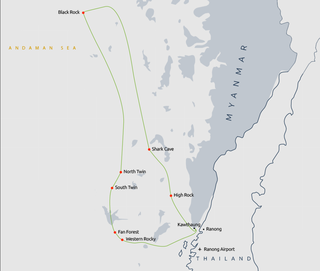 Our tour departs Brisbane, travelling via Singapore and then onto Phuket, where we will transfer to Ranong after processing at immigration, and then boarding Thailand Master and making our way to the Mergui Archipelago.